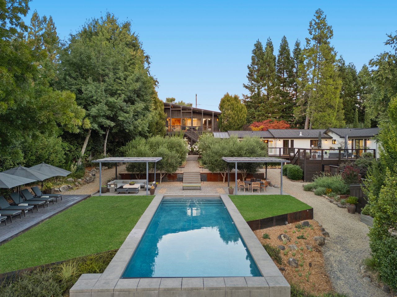 The property is designed as a private retreat featuring stunning views, long vistas, intimate pathways, and private gardens, with multiple outdoor spaces for entertaining and relaxation. The buildings and pool area are oriented west towards a 1-acre hillside olive grove which features a redwood and stone viewing terrace in the middle of the grove with panoramic views of the property.